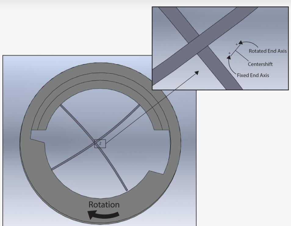 有許多主題和細微差別與C-FLEX產品線相關。一個常見的話題是“中心轉移”現象。中心偏移是樞軸的運動學屬性,表示軸彼此偏離中心的運動。樞軸的主體本質上是一個分成兩半的圓柱體,兩半通過彎曲交叉板簧而相對于彼此旋轉。軸的移動(稱為中心移動)是樞軸兩半之間旋轉的結果,如下圖和詳細信息所示。中心偏移的大小是樞軸直徑和操作角度的函數。在相同角度下,較大直徑的樞軸比較小的樞軸偏離中心更遠。對于大多數應用,**中心偏移小于 0.0005 英寸。此外,中心移位的高度可重復性允許在某些設備上校準位移。C-FLEX工程數據第 10 頁詳細介紹了中心移位的簡單近似值。使用該圖表,通過將樞軸直徑乘以與偏轉角度相對應的系數來進行計算。包括理論計算在內的更多具體信息請參閱白皮書“彎曲樞軸應用中的注意事項”。