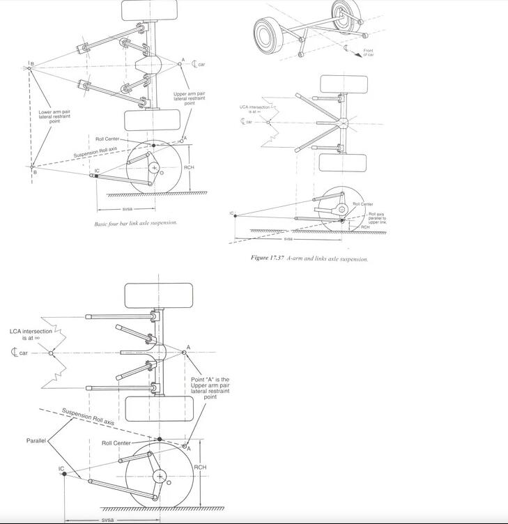 假設(shè)在一輛汽車中,你有一個經(jīng)典的雙轉(zhuǎn)臂后懸架,它將一個堅實的后軸固定在所述手臂和這些轉(zhuǎn)臂之間,并在左和右兩個轉(zhuǎn)軸點上。從幾何角度看,當汽車處于行駛高度時,系統(tǒng)的滾轉(zhuǎn)中心是如何發(fā)現(xiàn)的?